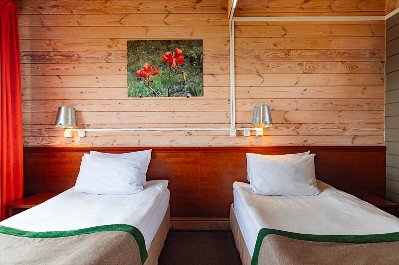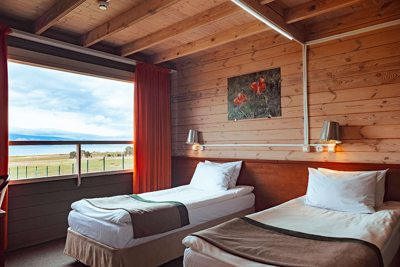 Единственный трехзвездочный отель на острове с открытым доступом к первой береговой линии. Отель предлагает 44 номера и 21 комфортабельный дом, интерьеры которых оформлены из природных материалов. Ресторан притягивает гостевой зоной с камином и авторской сибирской кухней. Уютная кофейня с террасой, предлагает авторские кофейные напитки и уникальную винную карту. Банный комплекс на берегу Байкала, прокат коньков, аренда байдарок и сап-бордов.